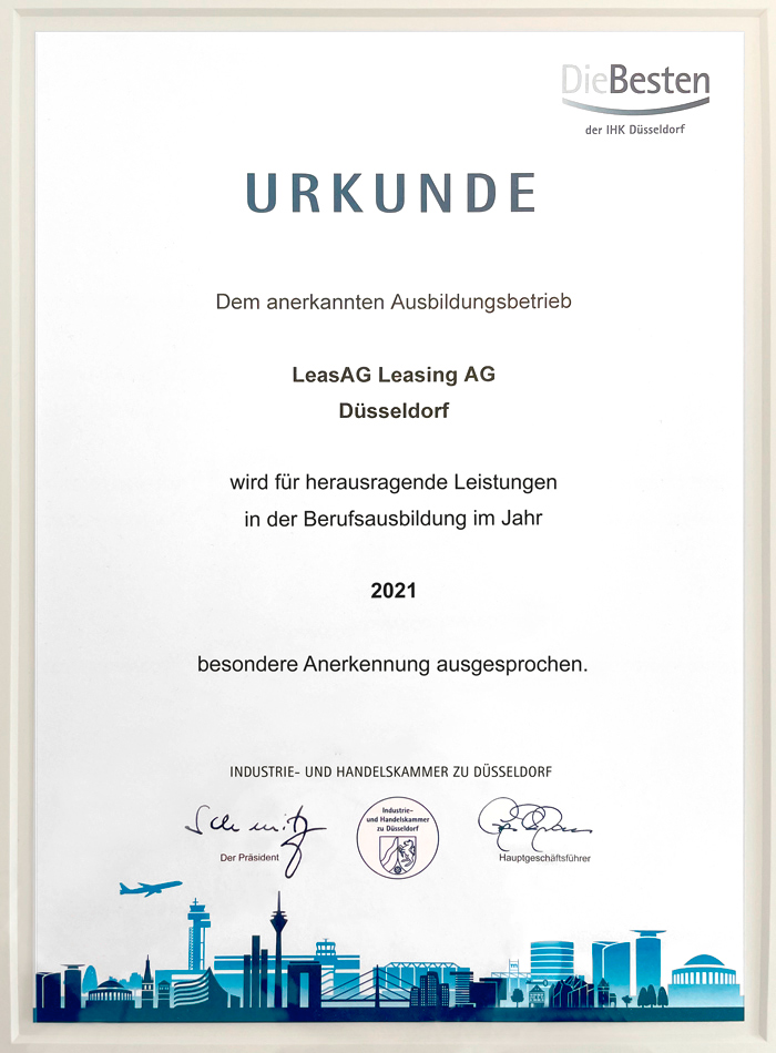 Wir bieten mit der SiA eine der innovativsten Ausbildungsmöglichkeiten an. Damit möchten wir unseren zukünftigen Mitarbeitern ein fundiertes fachliches und mit einer studienintegrierenden (dualen) Ausbildung darüberhinaus auch branchenübergreifendes Wissen ermöglichen.Mit der dualen Ausbildung bei der LeasAG bieten wir unseren Auszubildenden somit die beste Möglichkeit, einen hohen Qualitätsgrad ihrer Ausbildung zu erreichen.Aus gutem Grund wurden wir 2021 von der IHK für herausragende Leistungen in der Berufsausbildung ausgezeichnet.